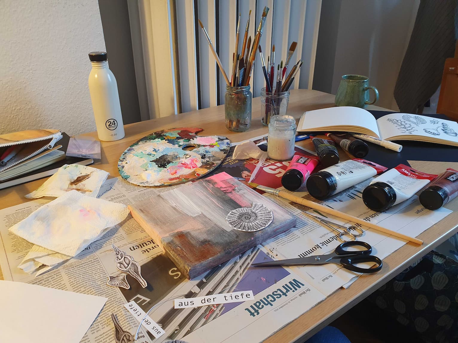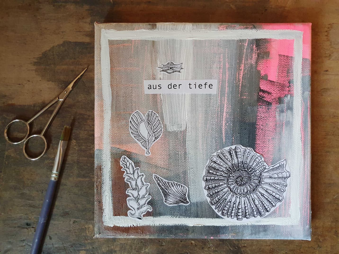 Nach dem Bemalen der Leinwand kommt mir die Idee, ich könnte meine eigenen Fineliner-Zeichnungen zum Unterwasser-Thema aus der Vergangenheit kopieren bzw. verkleinern und collagenartig darauf kleben. Dafür verwende ich wie meistens Acryl-Bindemittel. Mir gefällt, dass manche der Unterwasserlebewesen aussehen wie irgendwelche fliegenden Objekte aus einem Science Fiction-Film!