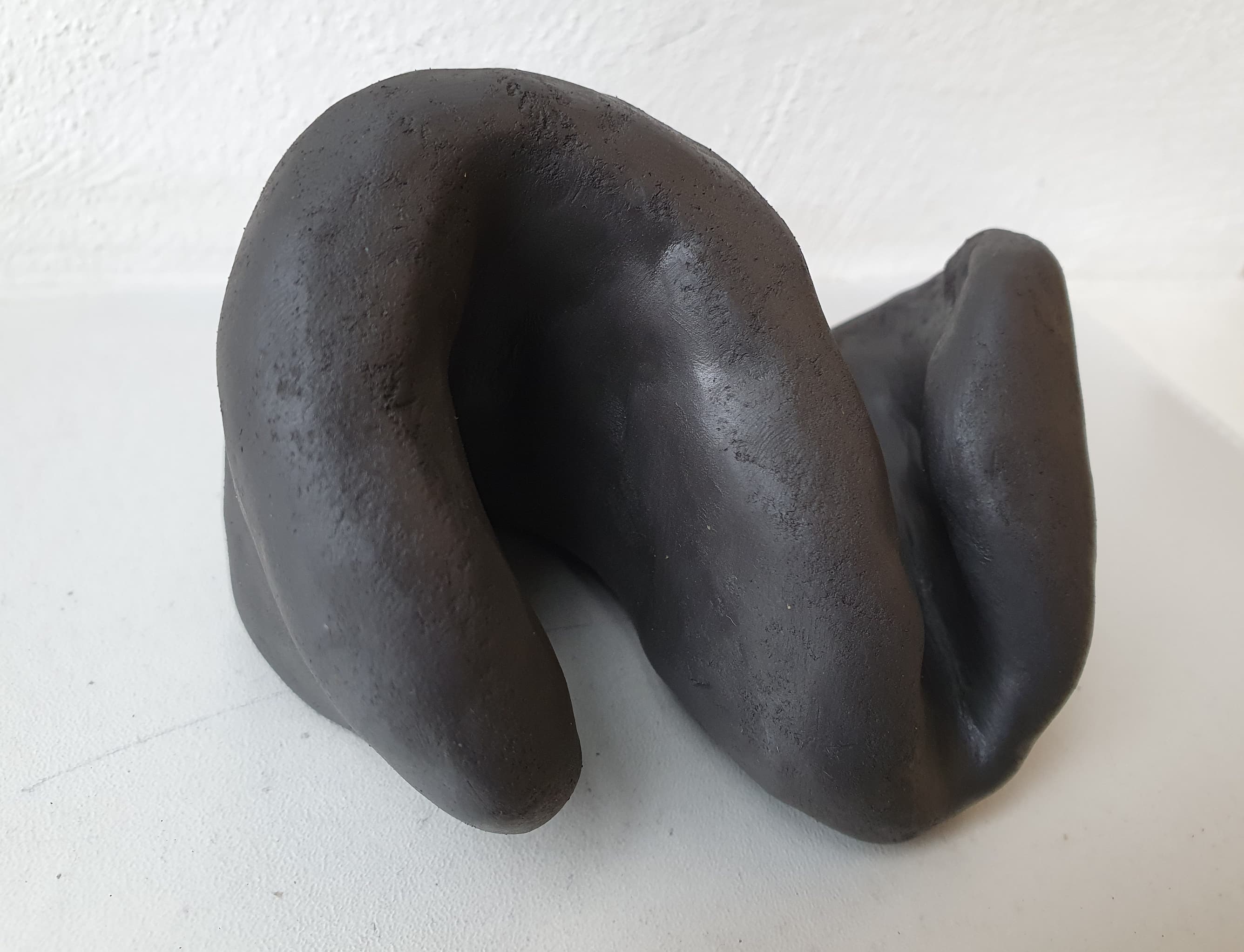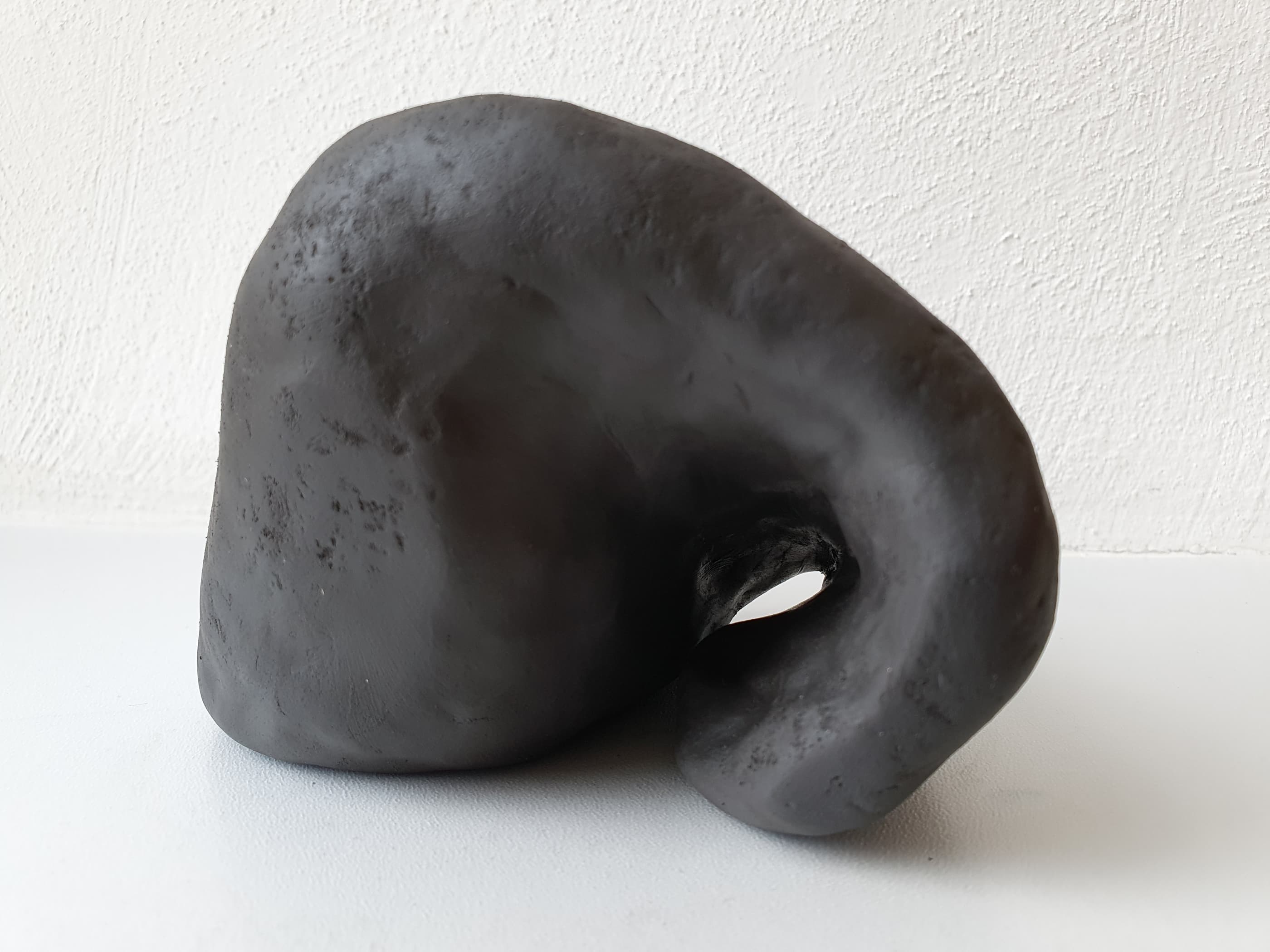 Nach der Mittagspause nehme ich die zweite Packung selbsthärtenden Ton in Angriff. Dieser Ton ist schwarz. Ich bin gespannt darauf, welchen Effekt das haben wird. Diesmal setze ich die Vorgabe des Schwebens um, indem ich den Ton teilweise in der Luft haltend bearbeite. Mit Wasser mache ich die Oberfläche weicher und geschmeidiger, da der Ton leicht antrocknet und Risse bekommt. Diesmal ist das Resultat ganz abstrakt (es hat kein Gesicht). Da mir die Oberfläche zu glatt ist, drücke ich am Ende noch einen Schwamm hinein, um für etwas mehr Textur zu sorgen. Beim Fotografieren muss ich dann feststellen, dass der schwarze Ton einiges schwieriger zu fotografieren ist als der naturfarbene.