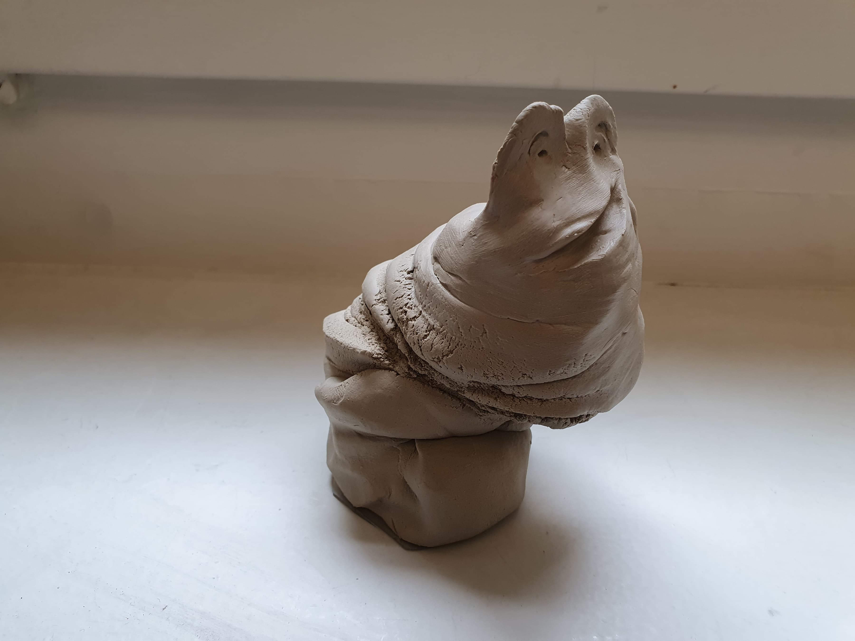Ich habe keinerlei Vorstellung, was aus dem Klumpen werden soll. Ich drücke, stosse, tupfe, schnippe, schiebe, gleite mit dem Finger darüber. Zuerst ensteht fast automatisch eine Art Gesicht daraus. Ich drücke ziemlich lang daran herum, aber irgendwie gefällt es mir nicht so richtig. Warum eigentlich immer ein Gesicht? Es könnte ja auch etwas Abstraktes sein? Etwas “Sinnloses”? Am Schluss wringe ich das Stück Ton. Dieser Effekt gefällt mir so gut, dass ich ganz spielerisch eine Art Gesicht dazu mache, und fertig ist das Wring-Ding: