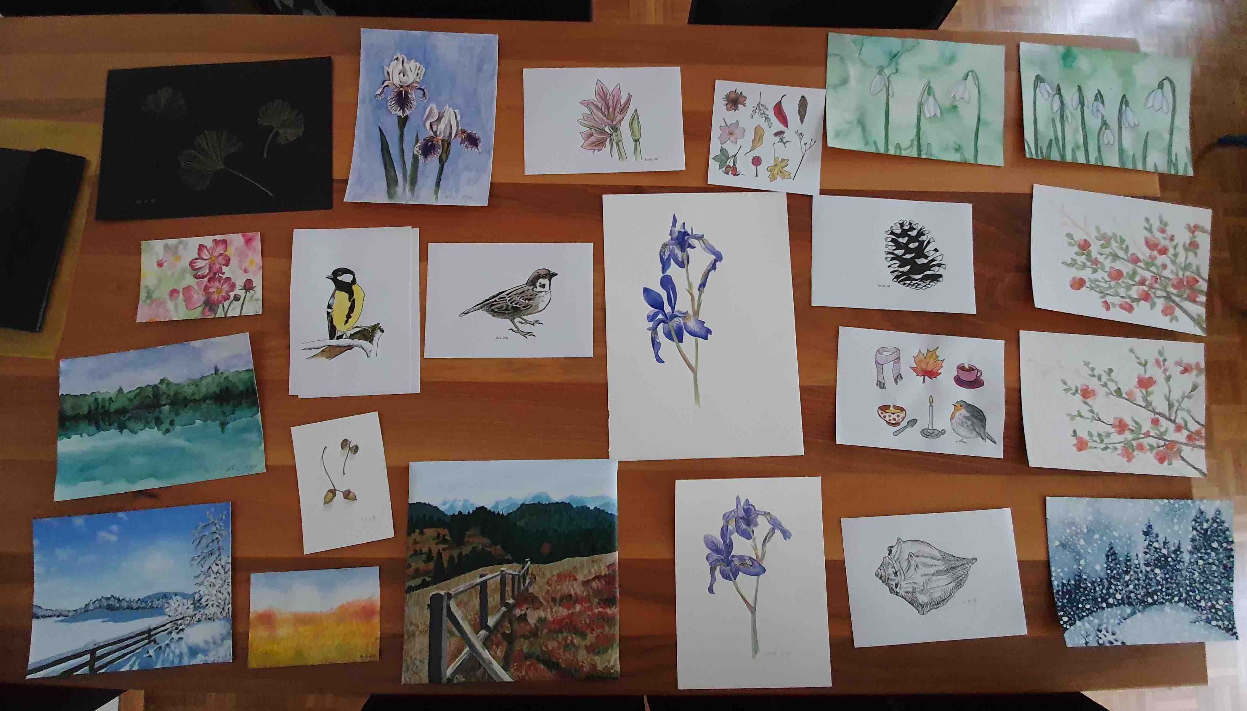 Es ist doch so einiges zusammengekommen, wie ich feststellen kann. Und es zeigt sich ziemlich rasch, welche Sujets ich bevorzuge: es ist die Natur in Landschaften, mit Blumen oder kleinen Vögelchen, gefolgt von Porträts und mit dem Schlusslicht abstrakte Bilder. Unbelebte Gegenstände habe ich kaum abgebildet, wie mir mit Erstaunen bewusst wird. Einmal malte ich drei alte Schlüssel und einmal eine Schere. Das war’s dann aber wohl schon!