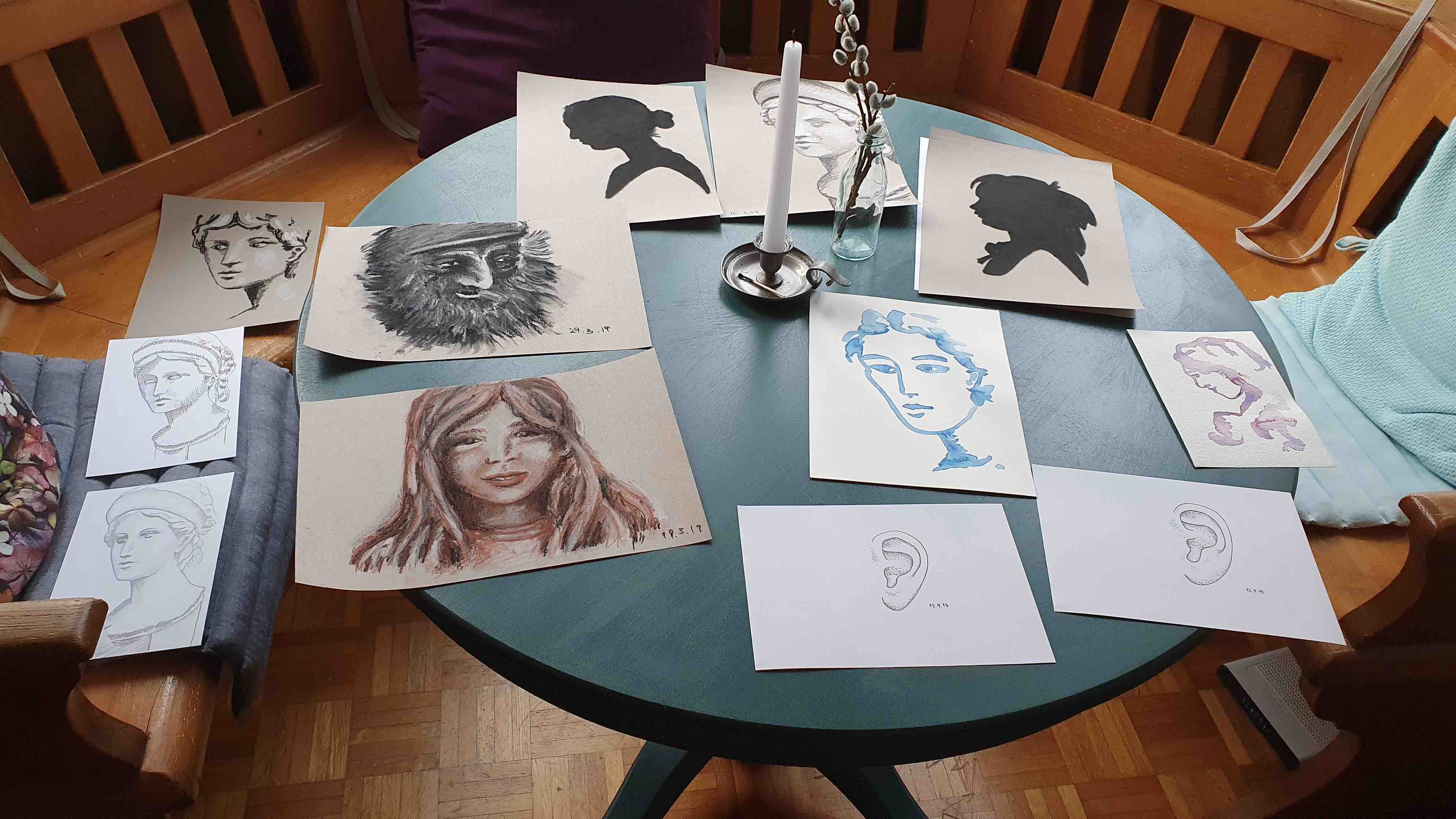 Am 6. März muss ich mich dringend um die Ausstellungsvorbereitungen für das Effinger-Jubiläum kümmern. Früh morgens zu Hause lege ich alle Arbeiten aus, die ich auf Anhieb in meiner “Malschublade” finden kann.