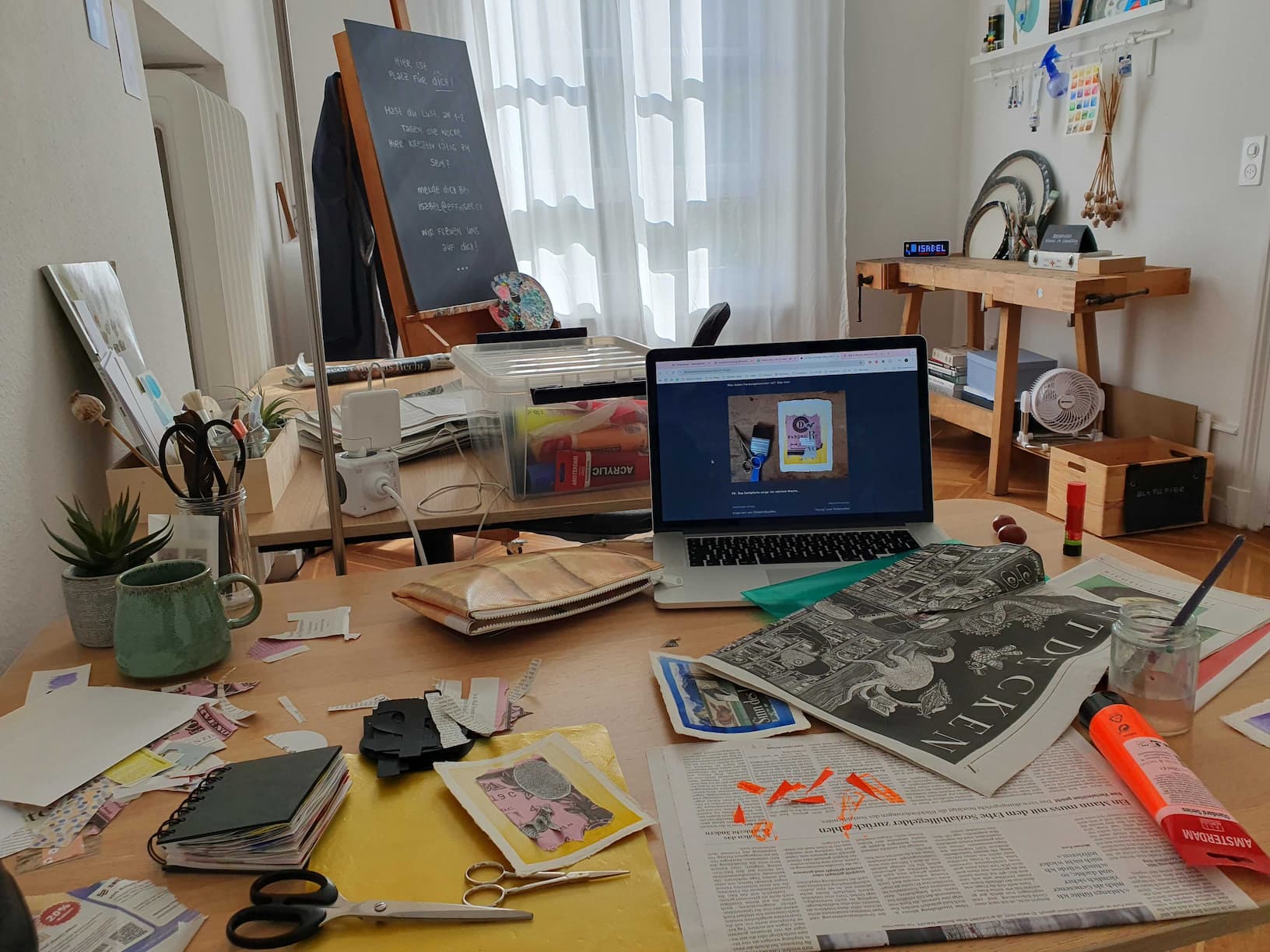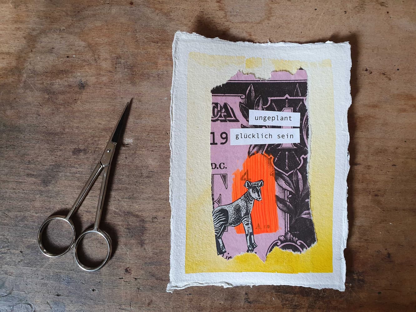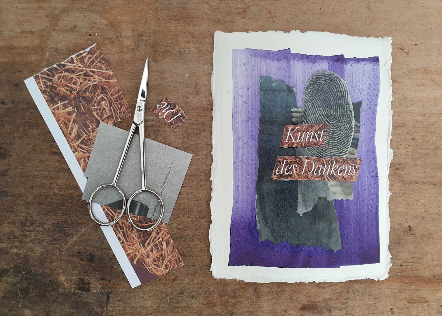 Nachdem ich letzte Woche gegenständlich gezeichnet habe, ist mir diese Woche nach etwas anderem. Ich entscheide mich dafür, die Serie der kleinformatigen Collagen weiterzuführen. Mein Arbeitsplatz versinkt bald einmal im Chaos, wie man oben sieht :-).