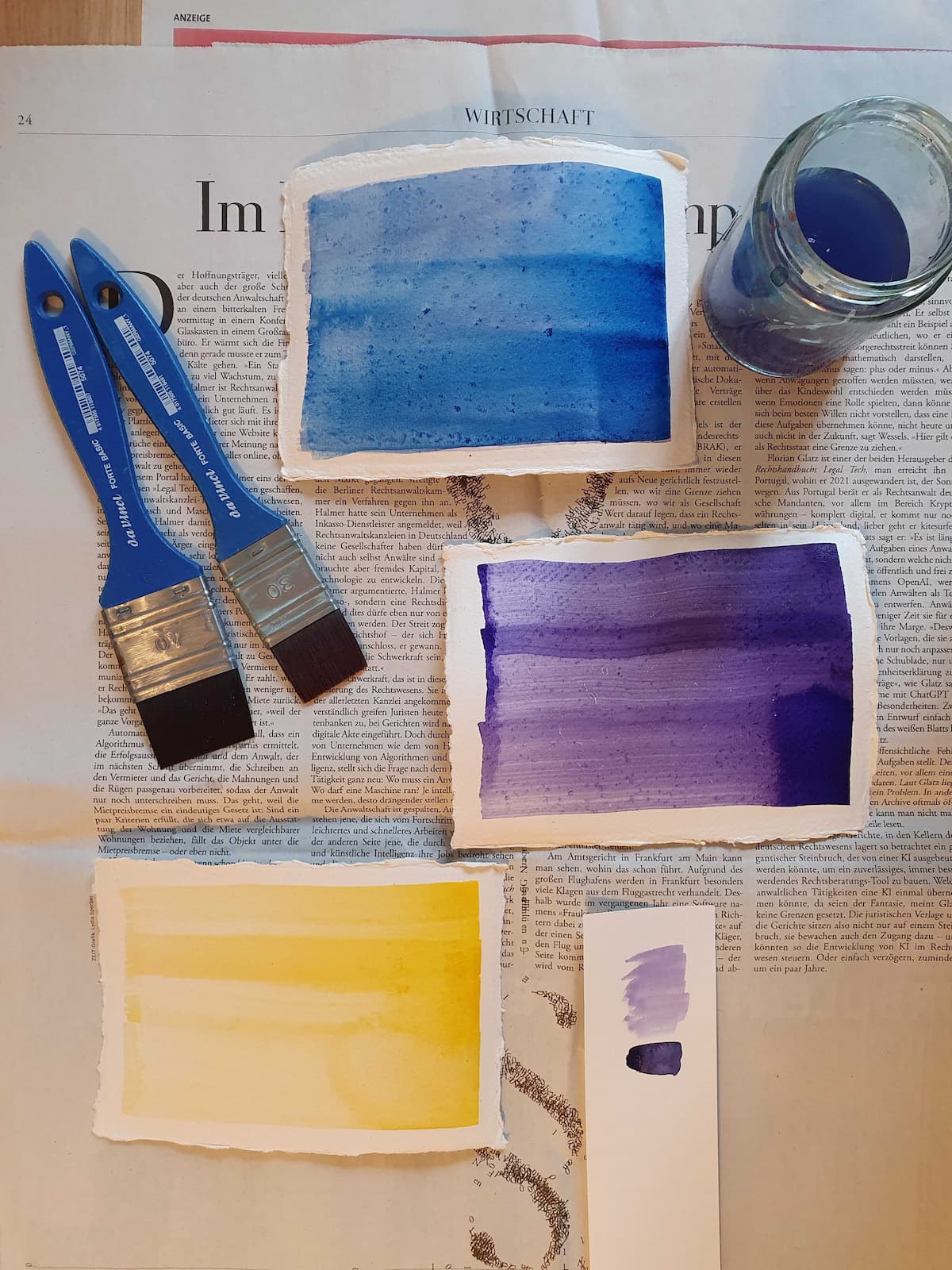 Es werden am Ende drei Collagen mit unterschiedlichen Hintergrundfarben: Blau, Gelb und Violett. Die Stile sind sehr unterschiedlich. Die Collage auf gelbem Hintergrund springt einen aufgrund des orangen Neon-Kleckses fast an. Die beiden anderen wirken zurückhaltender, weil sie in dunkleren Farben gehalten sind.
