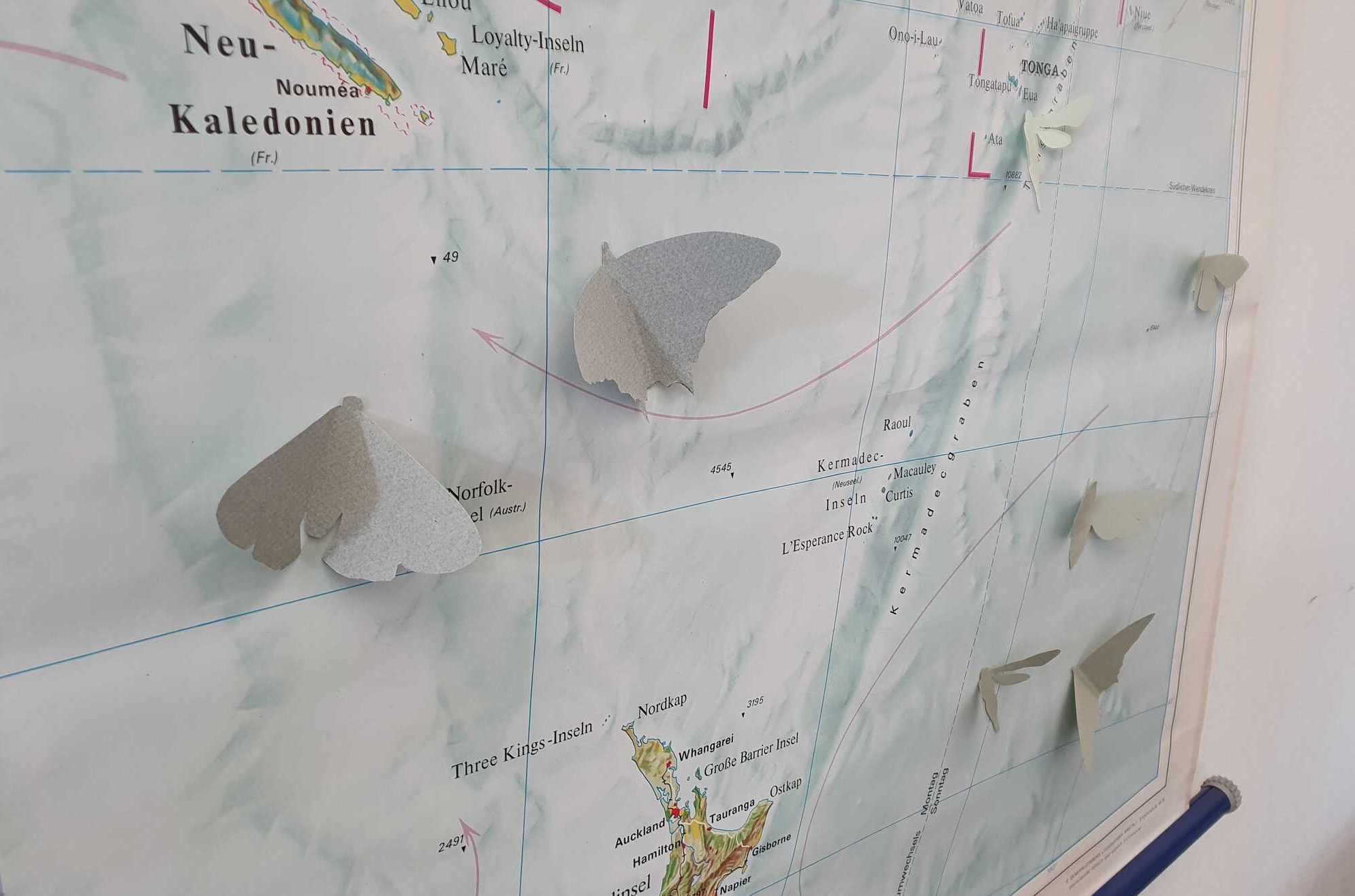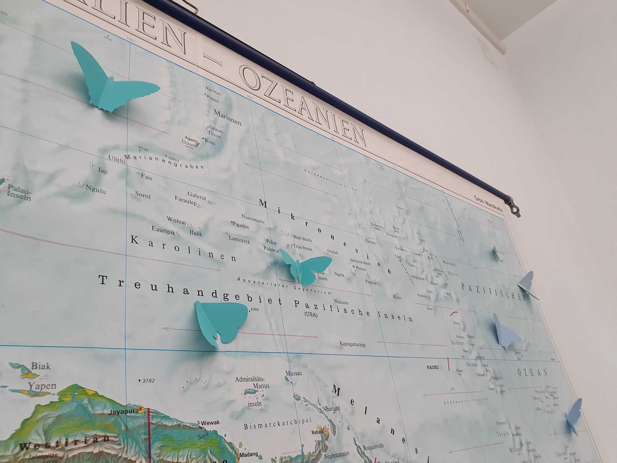 In der letzten Januarwoche bin ich abends bereits zu Hause etwas kreativ tätig, was mir, wie ich feststelle, gut tut. Ich komme also schon mit ein paar ausgeschnittenenen Schmetterlingen in den Effinger. Diesmal teste ich die Farben Blau und Grün. Als ich die Papierfalter diesmal versuchsweise auf die Karte klebe, fällt alles an seinen Platz. Das sind die richtigen Farben! Juhu!