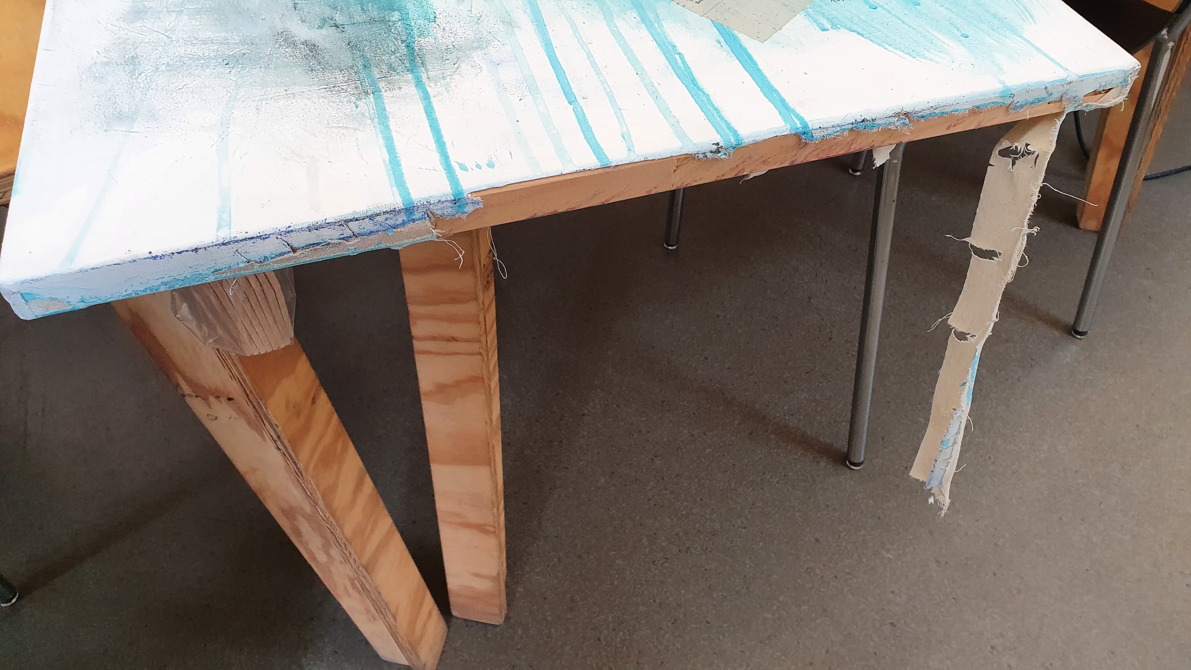 Danach will ich meine nächste Leinwand in Angriff nehmen bzw. nochmals eine alte Leinwand weiss grundieren, so wie ich das mit dieser Leinwand auch schon gemacht hatte. Da kommt der grosse Schreck: die Leinwand lässt sich nicht mehr von der Staffelei lösen! Ich ziehe und ziehe, aber sie klebt fest. Ich gehe mit dem Spachtel dahinter, und als ich damit nicht weiterkomme, mit einem Messer. Ich merke, dass die Leinwand beim Lösen kaputtgeht, dass ich sie zerschneide, aber ich habe keine andere Wahl, wenn ich jemals noch ein anderes Bild auf dieser Staffelei malen will! Das Acryl-Bindemittel, das ich zum Aufkleben der Zeitungsausschnitte benutzt hatte, war wohl hinuntergelaufen und hatte sich unter der Leinwand angesammelt… das passiert mir zum ersten Mal und ist ziemlich unschön: