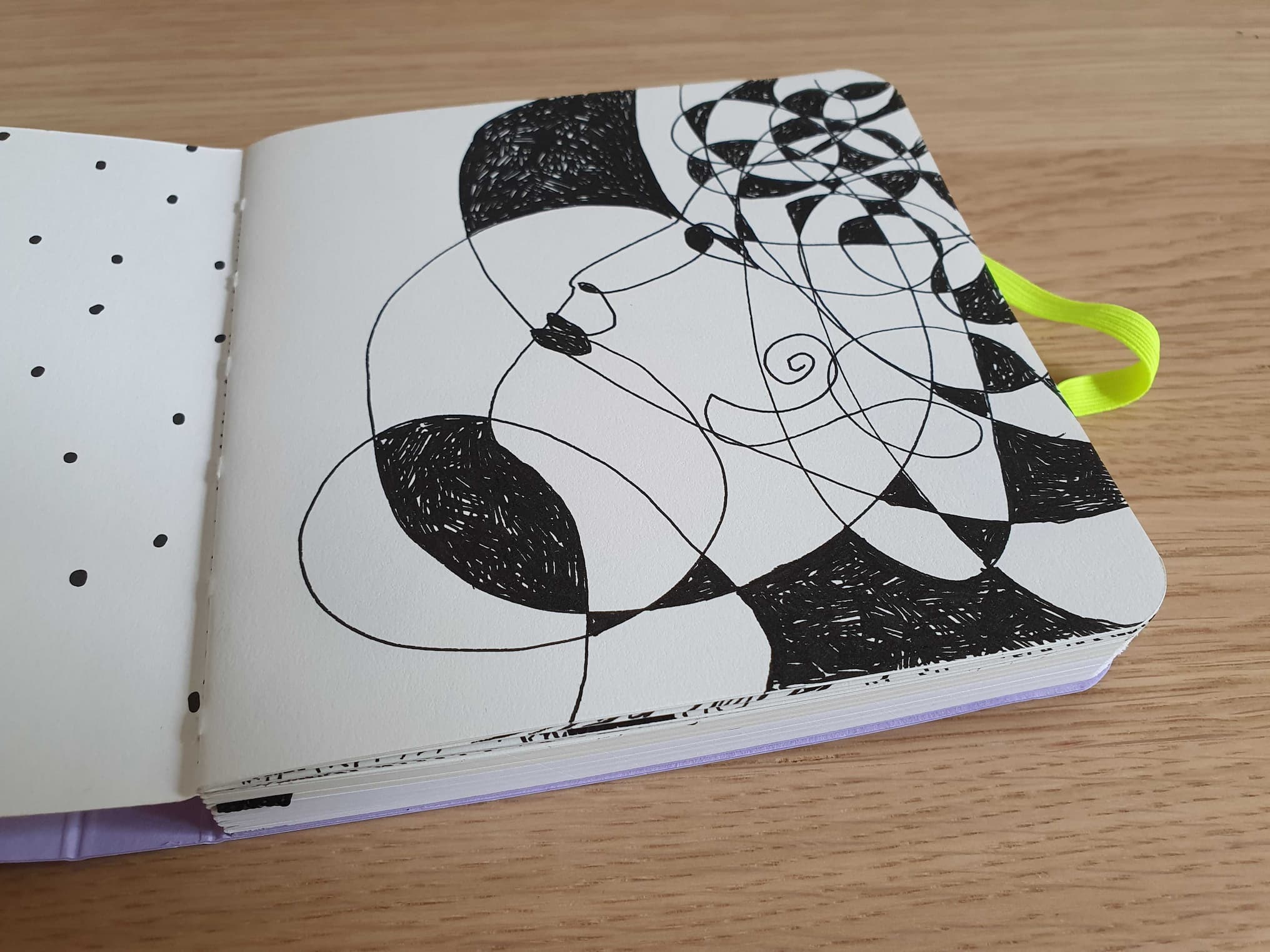 Darf ich vorstellen: mein neues Skizzenbuch. Es ist quadratisch, 12x12cm gross, mit abgerundeten Ecken, einem lila Cover und neongelben Gummizug. Ich betitle es mit “Meine Spielwiese” und nehme mir vor, es für Sinnloses, Lustiges und Spontanes zu nutzen.