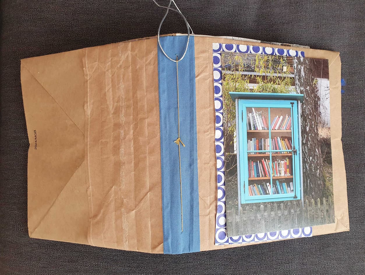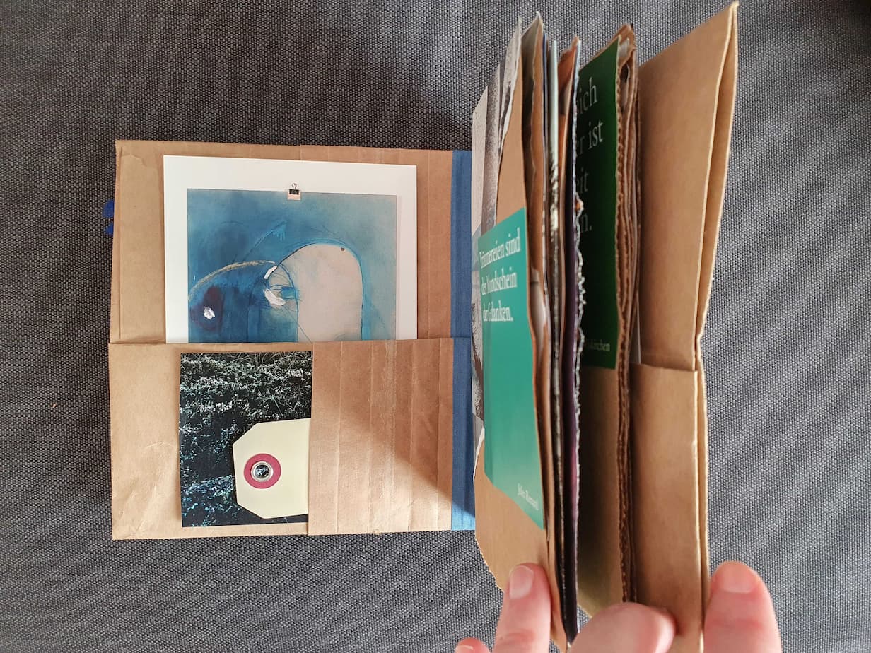 Unter der Anleitung von Annette Tillmann durfte ich am Kunstzmittag Ende Oktober aus einer Migros-Papiertasche ein kleines Buch herstellen. Hier sieht man noch knapp, dass der Einband des Büchleins aus dem Boden der Tüte besteht: