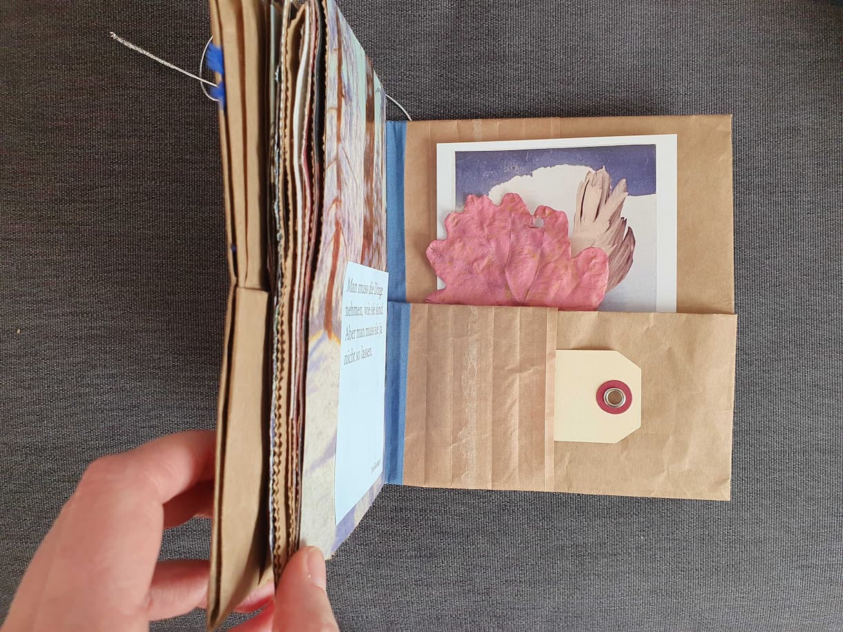 Die Papiertasche wurde zerschnitten, der Henkel auseinandergenommen und aufgeklebt (links vom blauen Buchrücken zu sehen), das Papier gefaltet und genäht, damit am Ende dieses Produkt entstand. Es ist sehr unperfekt: die Innenseiten habe ich etwas zu hoch oben eingenäht, alles ist schräg, und die Seiten habe ich mit dem Brieföffner aufgeschnitten, so dass sie etwas zerfranst wirken. Aber das hat seinen Charme! Besonders mag ich an diesem Büchlein, dass es auf der Innenseite des Einbands hinten und vorne kleine Taschen hat, in die man Dinge hineinstecken kann: