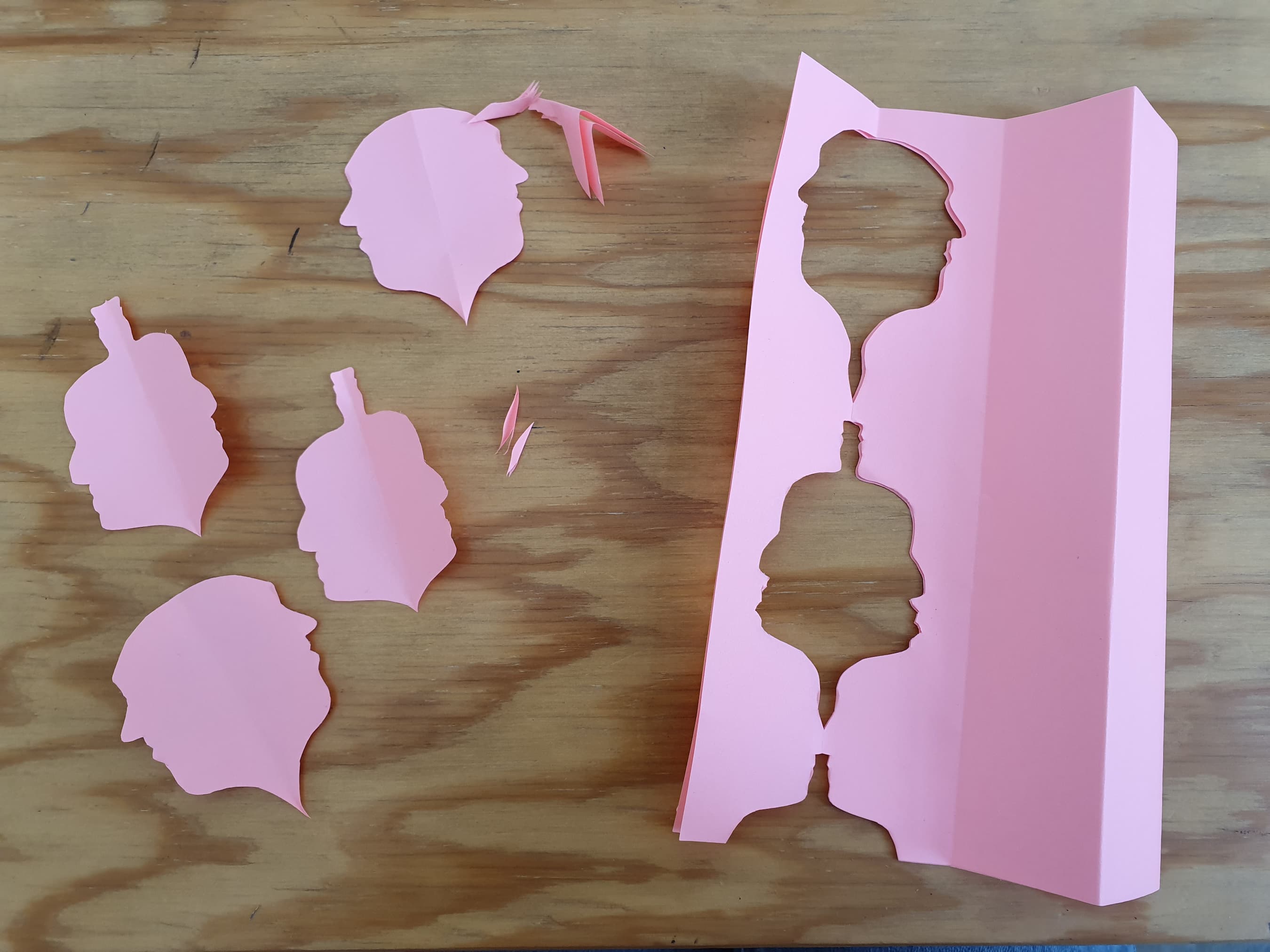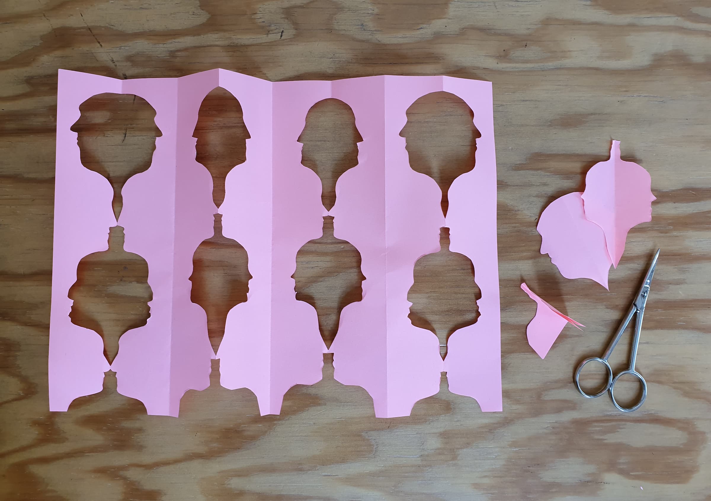 Ich könnte mir vorstellen, in einem nächsten Schritt einen noch etwas regelmässigeren weissen Scherenschnitt anzufertigen, da hier die Köpfe af unterschiedlicher Höhe sind. Und dann würde ich Zeitung und Scherenschnitt hinter Glas rahmen, damit der Scherenschnitt glatt aufliegt. Das Zeitungspapier würde mit der Zeit vergilben, schneller als das weisse Papier. Das gäbe aber auch einen tollen Effekt.