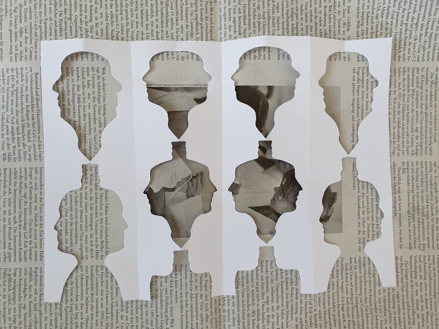 Zum Schluss schneide ich noch einen Scherenschnitt aus weissem Papier und lege ihn auf einen Zeitungsartikel, in dem es um Corona geht. Weil das für mich ebenfalls mit dem Thema zu tun hat: manche werfen den Medien vor, eine einseitige Berichterstattung zu pflegen bzw. nicht die ganze Wahrheit zu sagen und lesen sie deswegen gar nicht mehr.