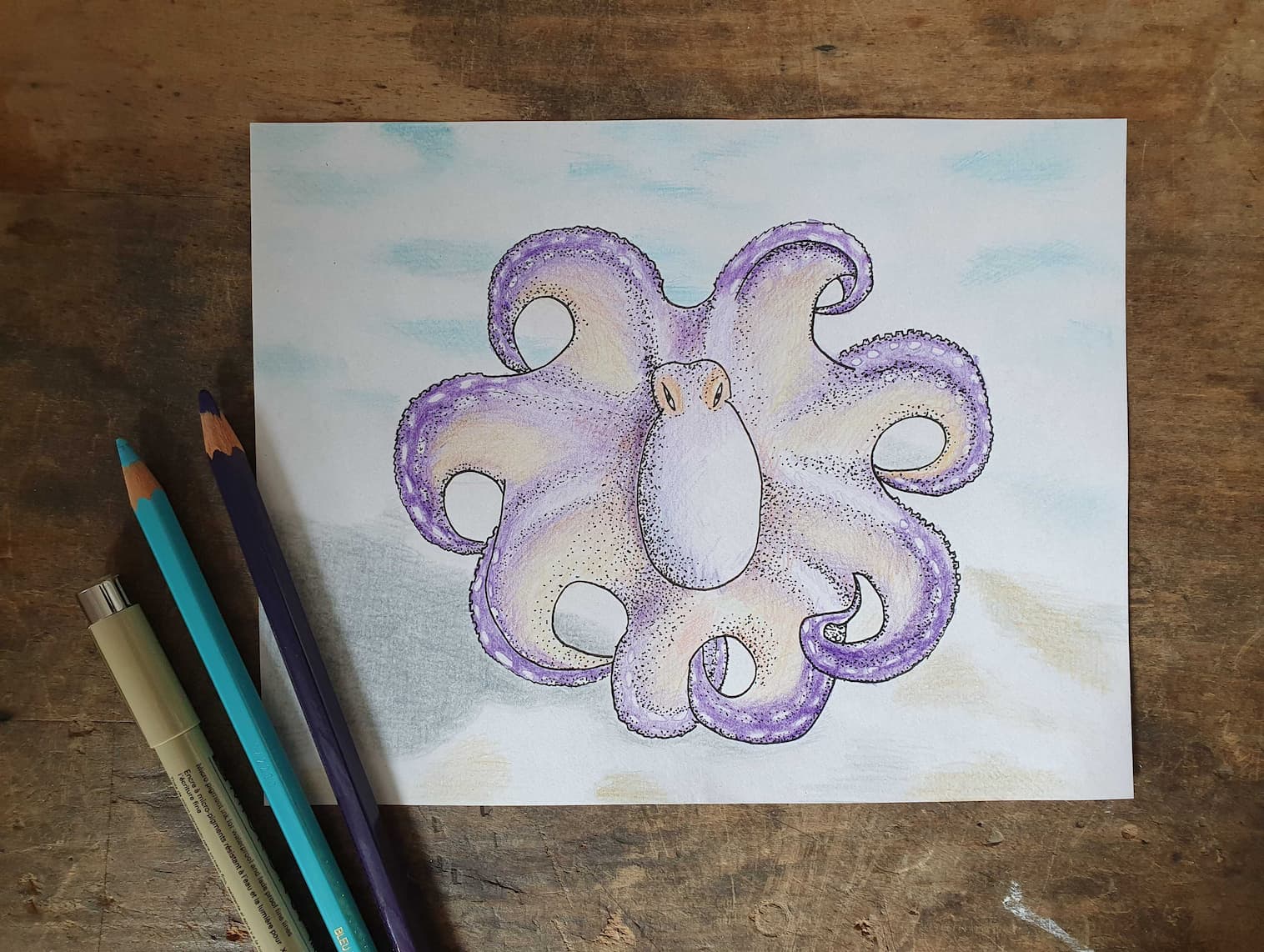 So nehme ich wiederum die Buntstifte zur Hand, die mich nun schon fast mein ganzes Leben lang begleiten. Violett, Türkisblau, Orange und Grau sind darunter. Und da der Octopus eine so aussergewöhnliche Farbe hat, nenne ich ihn Viola :-). Witzig finde ich, dass er ohne Farben leicht bedrohlich wirkt. In Farbe jedoch hat er fast etwas Herziges. Findet Ihr nicht auch?